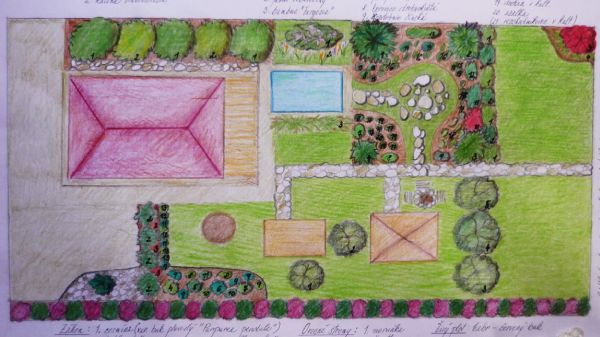 Nabízíme také ručně kreslené návrhy, které rychle a přehledně zachytí rozvržení vaší budoucí zahrady. Skica znázorňuje rozmístění stavebních prvků, trávníků i výsadbu s názvy rostlin v češtině i latině včetně počtu kusů.